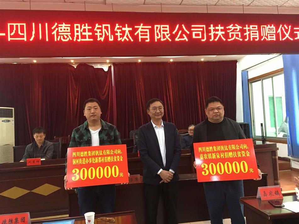 此次,四川德胜集团钒钛有限公司分别向铜河街道的新都村和嘉农镇的新泉村各捐赠了扶贫资金人民币30万元,共60万元,主要用于两村道路和产业发展项目建设。