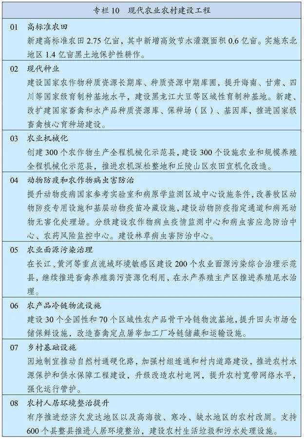夯实粮食生产能力基础,保障粮、棉、油、糖、肉、奶等重要农产品供给安全。坚持最严格的耕地保护制度,强化耕地数量保护和质量提升,严守18亿亩耕地红线,遏制耕地“非农化”、防止“非粮化”,规范耕地占补平衡,严禁占优补劣、占水田补旱地。以粮食生产功能区和重要农产品生产保护区为重点,建设国家粮食安全产业带,实施高标准农田建设工程,建成10.75亿亩集中连片高标准农田。实施黑土地保护工程,加强东北黑土地保护和地力恢复。推进大中型灌区节水改造和精细化管理,建设节水灌溉骨干工程,同步推进水价综合改革。加强大中型、智能化、复合型农业机械研发应用,农作物耕种收综合机械化率提高到75%。加强种质资源保护利用和种子库建设,确保种源安全。加强农业良种技术攻关,有序推进生物育种产业化应用,培育具有国际竞争力的种业龙头企业。完善农业科技创新体系,创新农技推广服务方式,建设智慧农业。加强动物防疫和农作物病虫害防治,强化农业气象服务。
