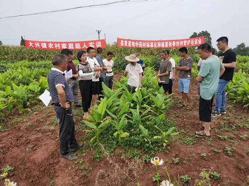 7月以来,犍为县科技特派员服务团、县发改局、县扶贫“两会”、县农业技术推广中心在孝姑镇、大兴镇、九井镇分期分批开展了“走进科技你我同行”农村实用技术姜黄田间管理及主要病虫害防控技术培训会。农业高级专家杨玉国、胡月瑛、县扶贫“两会”会长罗显成等参加了培训工作。针对六月底七月以来的高温、干旱影响,姜黄中药材病虫害发生面广、危害重,三个镇党委、政府高度重视,积极组织姜黄种植大户、专业合作社成员、示范户,在田间地头召开现场培训会,指导农户对姜黄的水肥管理,病虫害综合防控。共开展培训五期(次),培训农户、村社干部、专业合作社成员共550余人,发送技术资料4500多份。