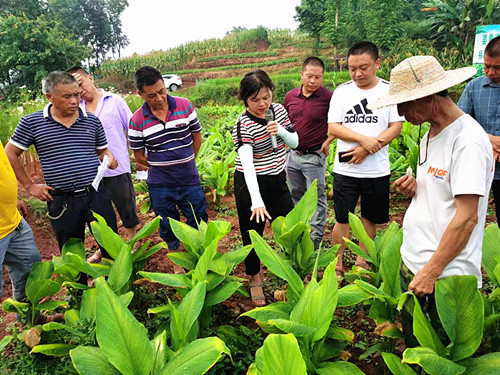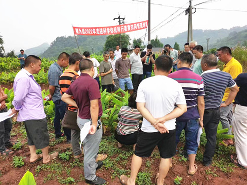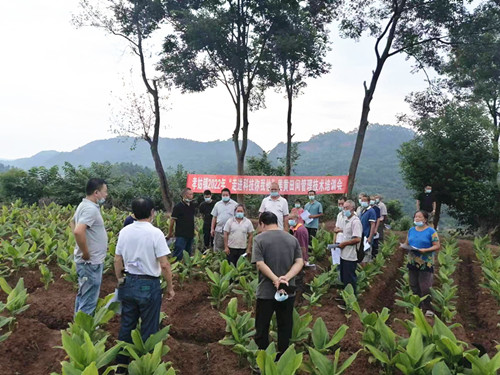 科技人员、镇村干部顶烈日,冒酷暑,认真讲解姜黄当前田间水肥管理及病虫害综合防控的关键点和重点环节。研究员杨玉国采用通俗易懂的“田坎语言”向参训人员详细讲解了姜黄种植的几种常见病以及对应防治技术,详细介绍了药物使用方法并进行现场演示,解答了种植户普遍关注的种植问题。杨玉国强调:一是要改变传统粗放的种植观念,实行姜黄轮种、粮经套种,加强“炭疽病”等常见病虫害防治,做到早发现、早防治;面对今年罕见高温干旱天气,要注意补充水分、养分,并适当进行追肥。二是希望进一步发挥农村家庭能人的示范带头作用,要与农技专家加强沟通交流,加强宣传和技术推广。三是要不断完善基础设施配套,积极争取蓄水池等小农水利项目,为姜黄等农作物种植提供全方位保障,提升产量和质量。