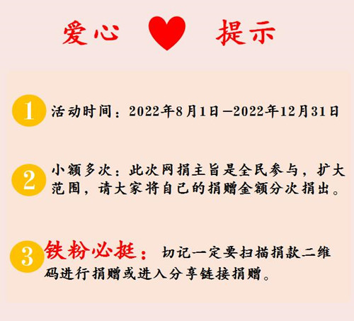 三、众人拾柴火焰高,能力不分大小,捐款不分多少,善举不分先后,贵在一份爱心。或许您的一份善心,能拯救一个家庭;或许您的一次善举,能点亮希望的曙光;或许您的一个善念,能改变他们一生的命运…...每一个“或许”的实现,困难的人们会感受到人间的温暖,社会的愿景会更加美好!