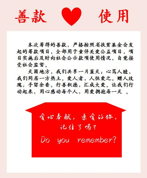 我们承诺让爱在阳光下运行,接受社会各界监督。活动结束后,我们将在新闻媒体上公示资金捐赠和使用情况,接受社会监督。